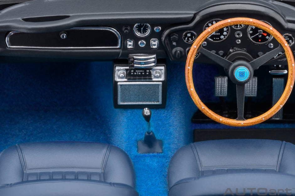 1963年のフランクフルトショーでデビューした『アストン マーチン DB5』は、鋼管フレームにアルミパネルを被せるスーパーレッジェーラ工法のボディに軽合金製4リッター直列6気筒DOHCエンジンを搭載、最高速度240km/h以上を記録するスポーツクーペです。後に映画007シリーズのボンドカーとして採用され象徴的な存在となり、歴代DBシリーズの中でも特に高い人気を誇ります。オートアートでは、ボディ各所の美しいメッキパーツ、エンジンルーム内やワイヤースポークホイール、インテリアなどの細部までリアルに再現しました。