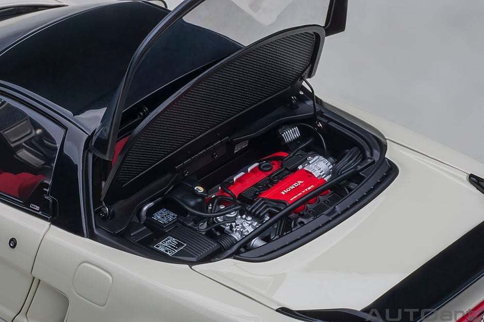 オートアートでは、ホンダのレーシングスピリットの象徴をリアルにモデル化。ダクト付きカーボンボンネットや大型カーボンリアスポイラー、専用開発のタイヤ&ホイール、後期型の特徴の立体的固定式ヘッドライトをはじめ、インテリアのレカロ製カーボンフルバケットシート、MOMO製ステアリングとチタンシフトノブ、サイドシルの専用シリアルプレートまで忠実に再現しました。
