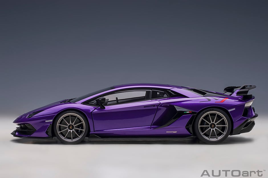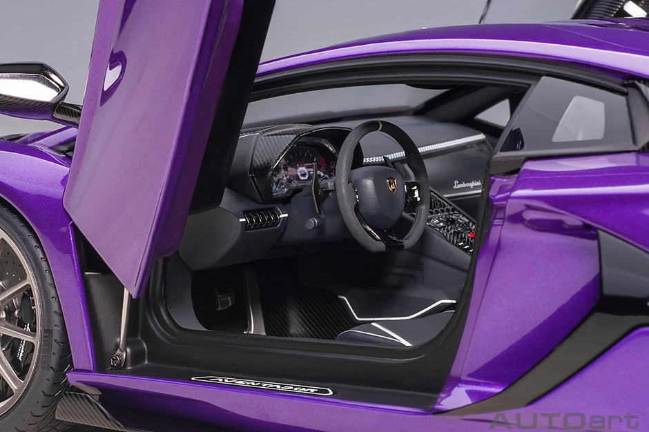 最大770hpの自然吸気6.5リッターV12エンジンを搭載し、最高速度は350km/h以上を記録します。オートアートでは、特別なオーラを放つ斬新なフォルムを実車に忠実に再現。ランボ伝統のシザーズドアや格納式リアウイングは可動し、エンジンフードは脱着可能。美しいカーボンボディや、カーボン製ファンを組み合わせた専用ホイールなど細部もリアルに再現しました。